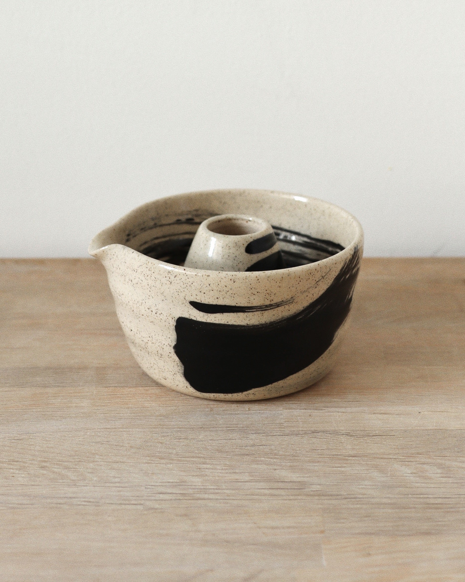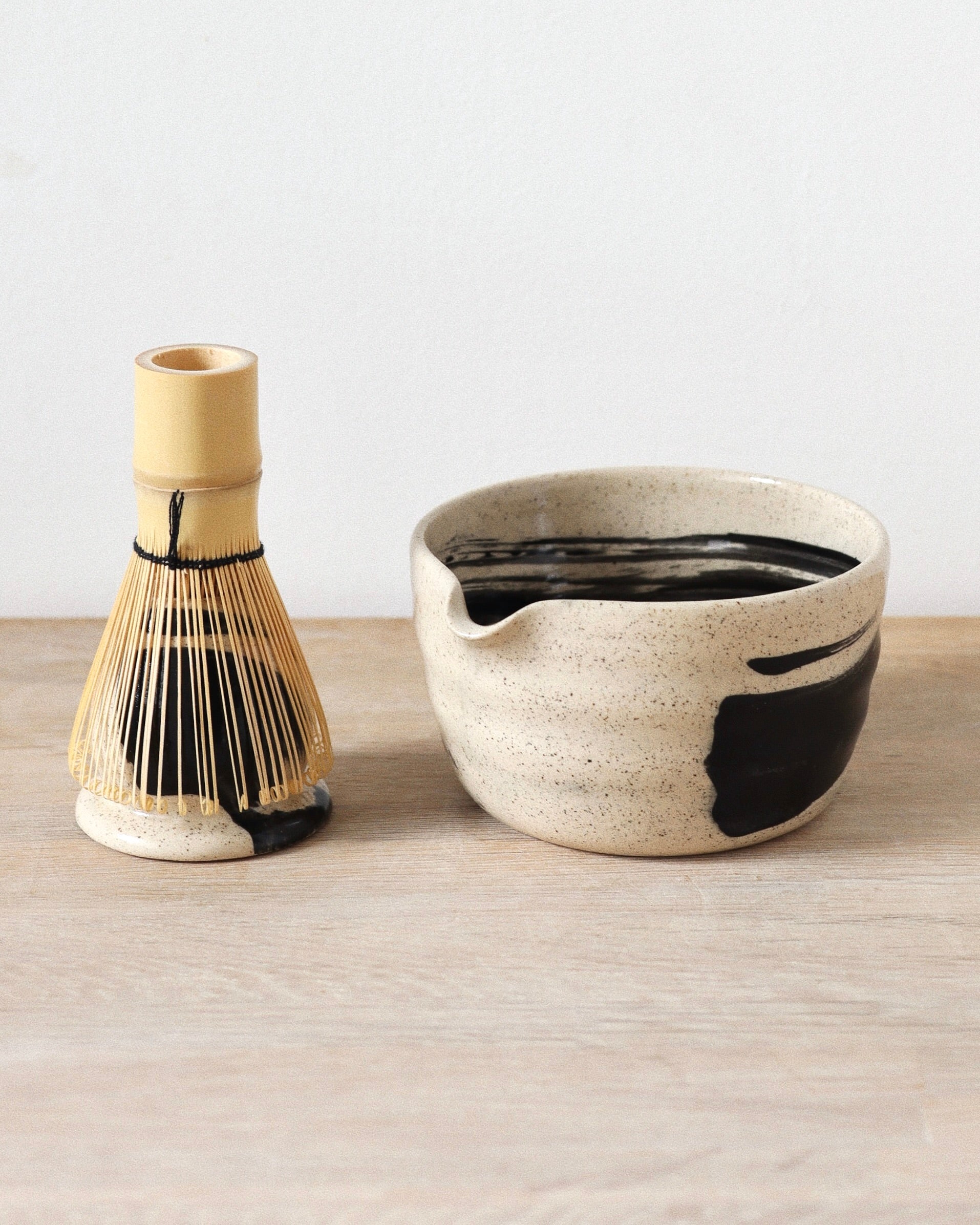 This matcha duo of is crafted from white speckled stoneware and finished in a clear glaze, accentuated by expressive brushstrokes that bring gentle movement to the surface. The set consists of a matcha bowl + whisk holder.