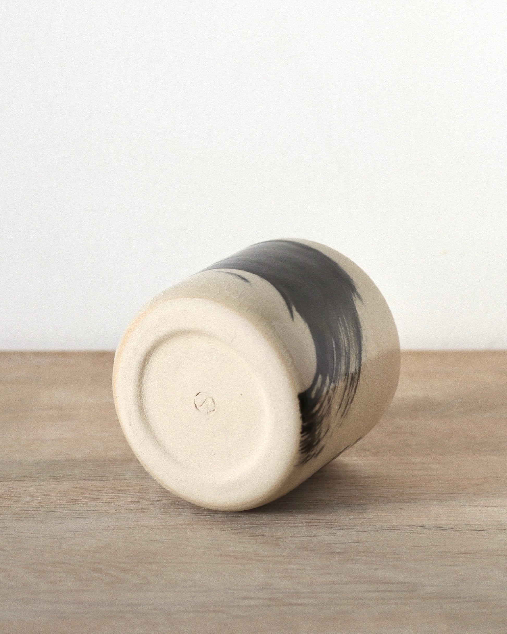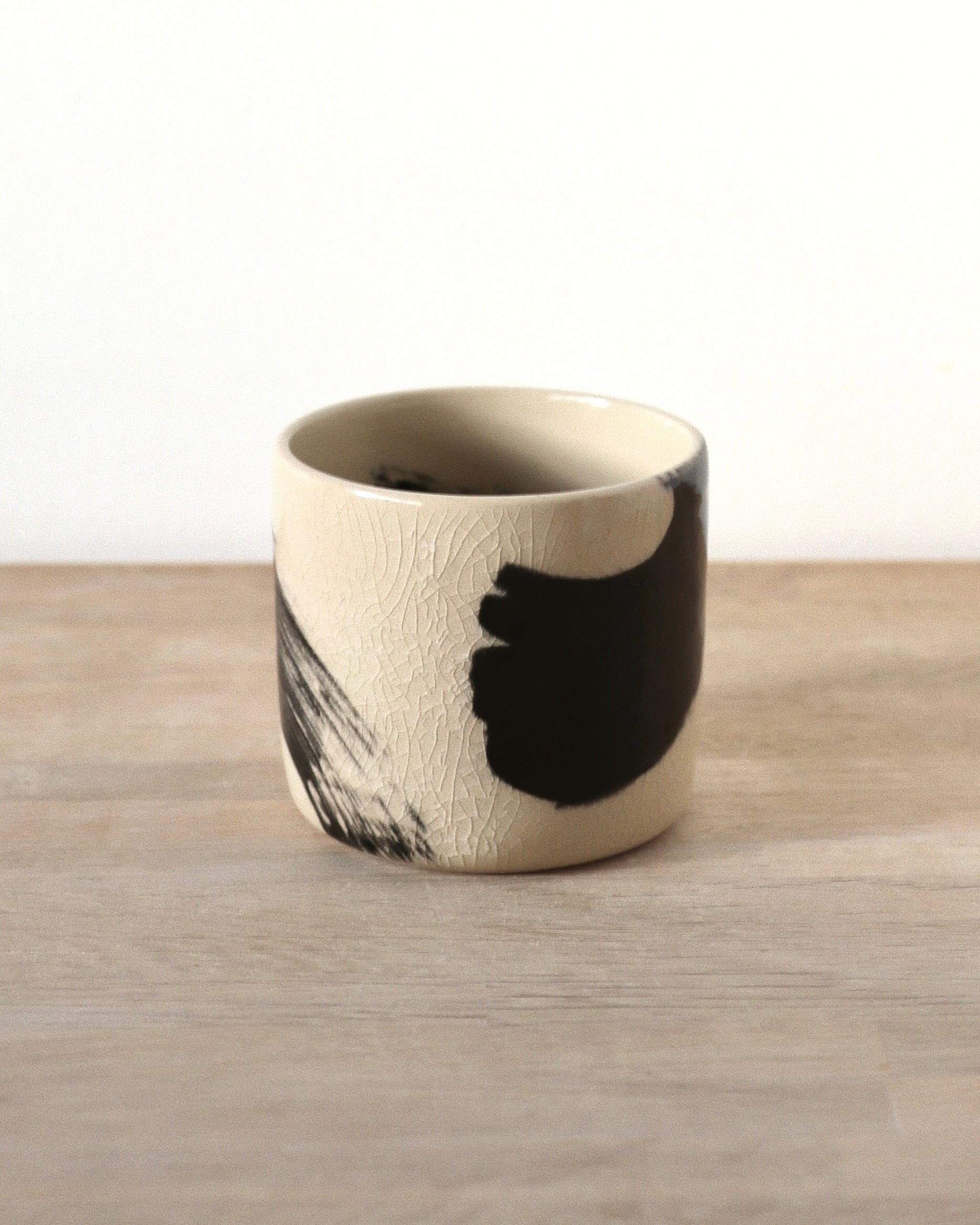 This wheel-thrown cup is crafted from white stoneware and decorated with expressive black brushstrokes. It’s finished in a clear crackled glaze, giving the piece a lot of detail and character up close. Crackled glazes deepen subtly over time as the glaze matures. Fired twice, up to 1220 °C, ensuring durability and a refined finish.