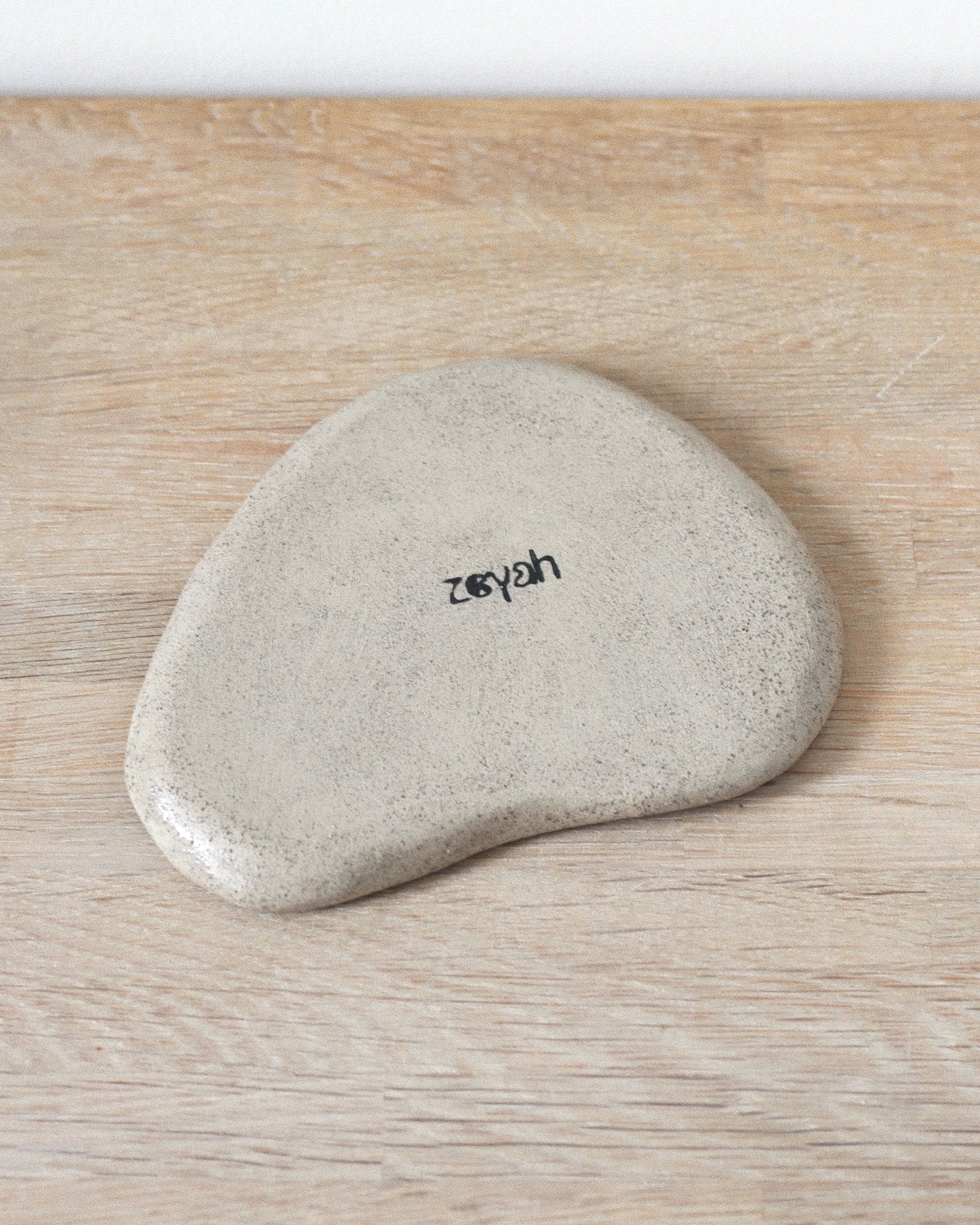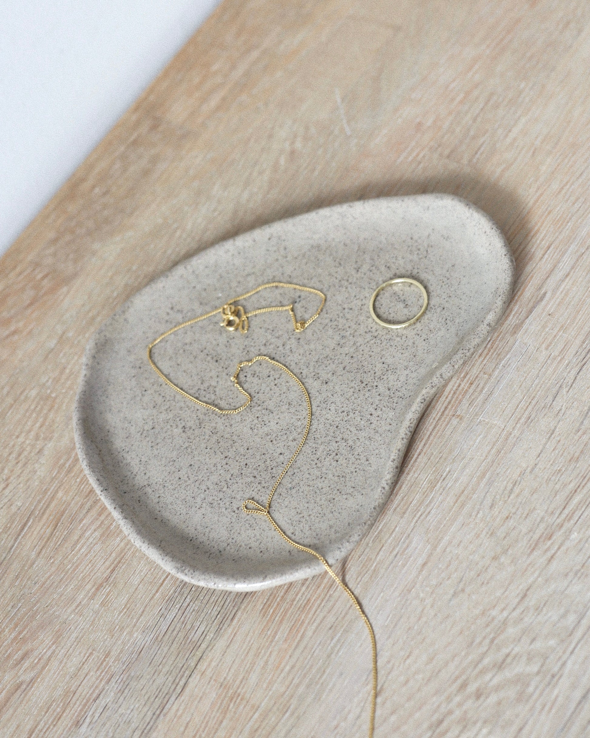 This hand-built dish is crafted from textured speckled grey stoneware and finished clear glaze that brings out the natural textures of the clay. Its form makes it ideal for storing jewelry, keys, or other small items, or as a minimal serving plate for snacks or small bites. Fired twice, up to 1220 °C, giving it strength and a refined finish while preserving a calm, understated aesthetic.