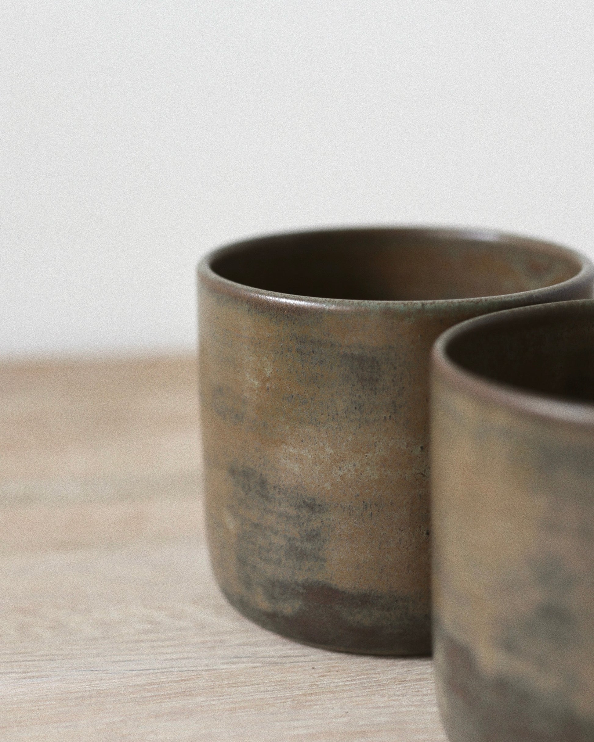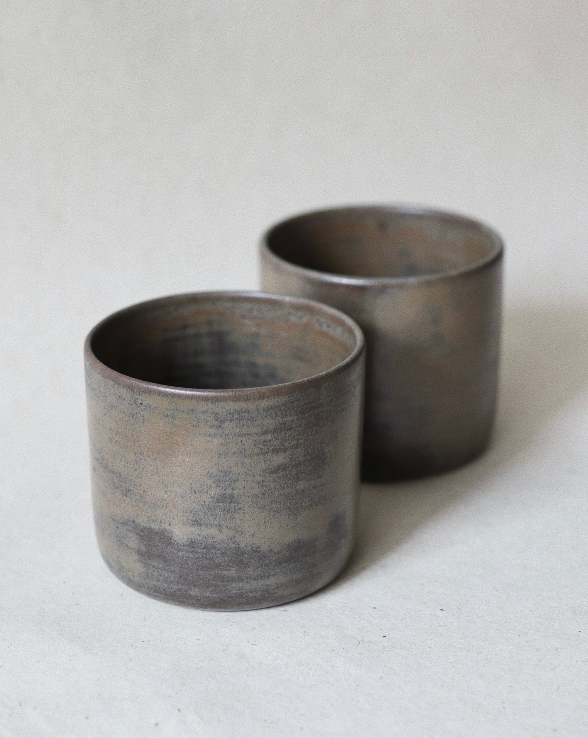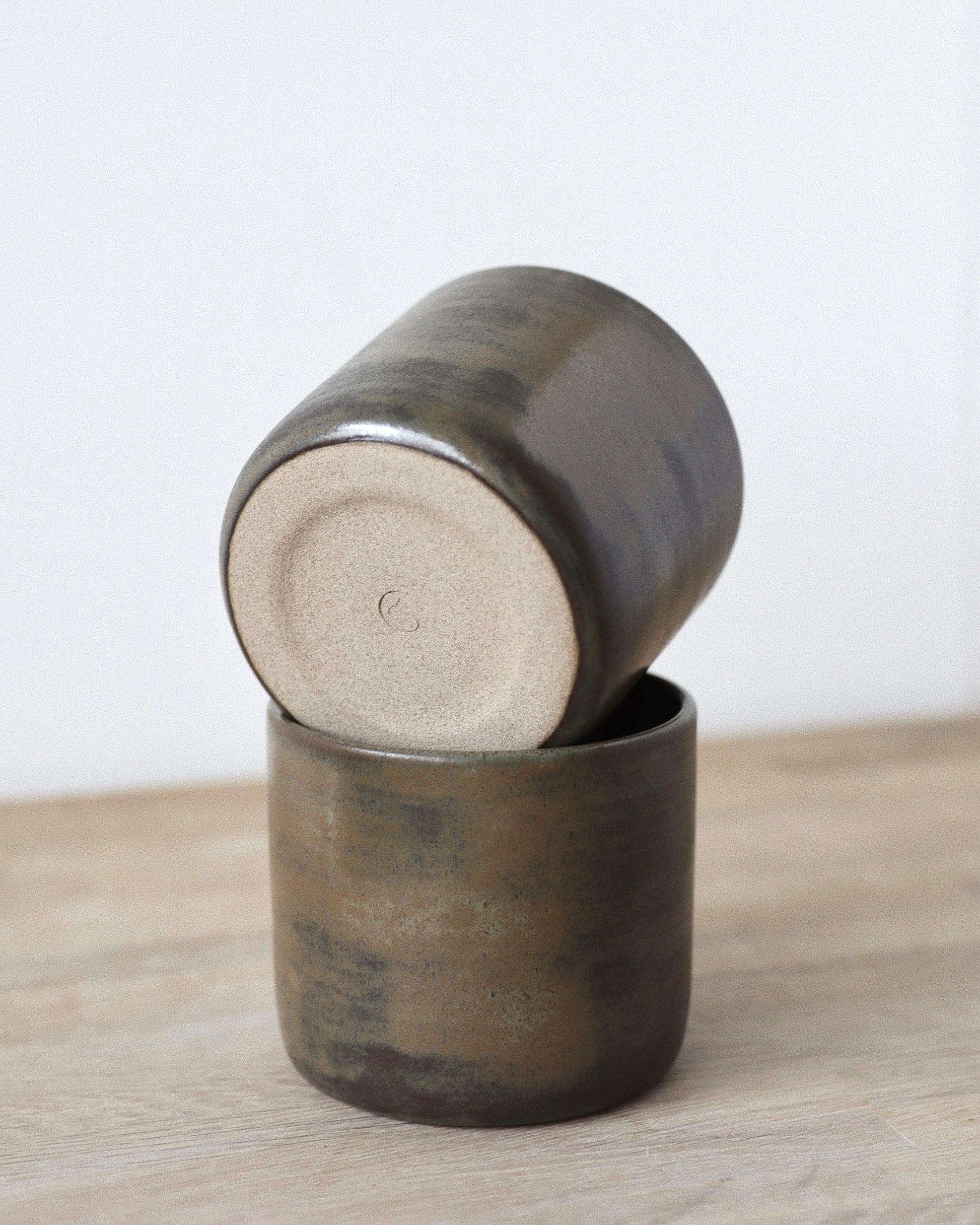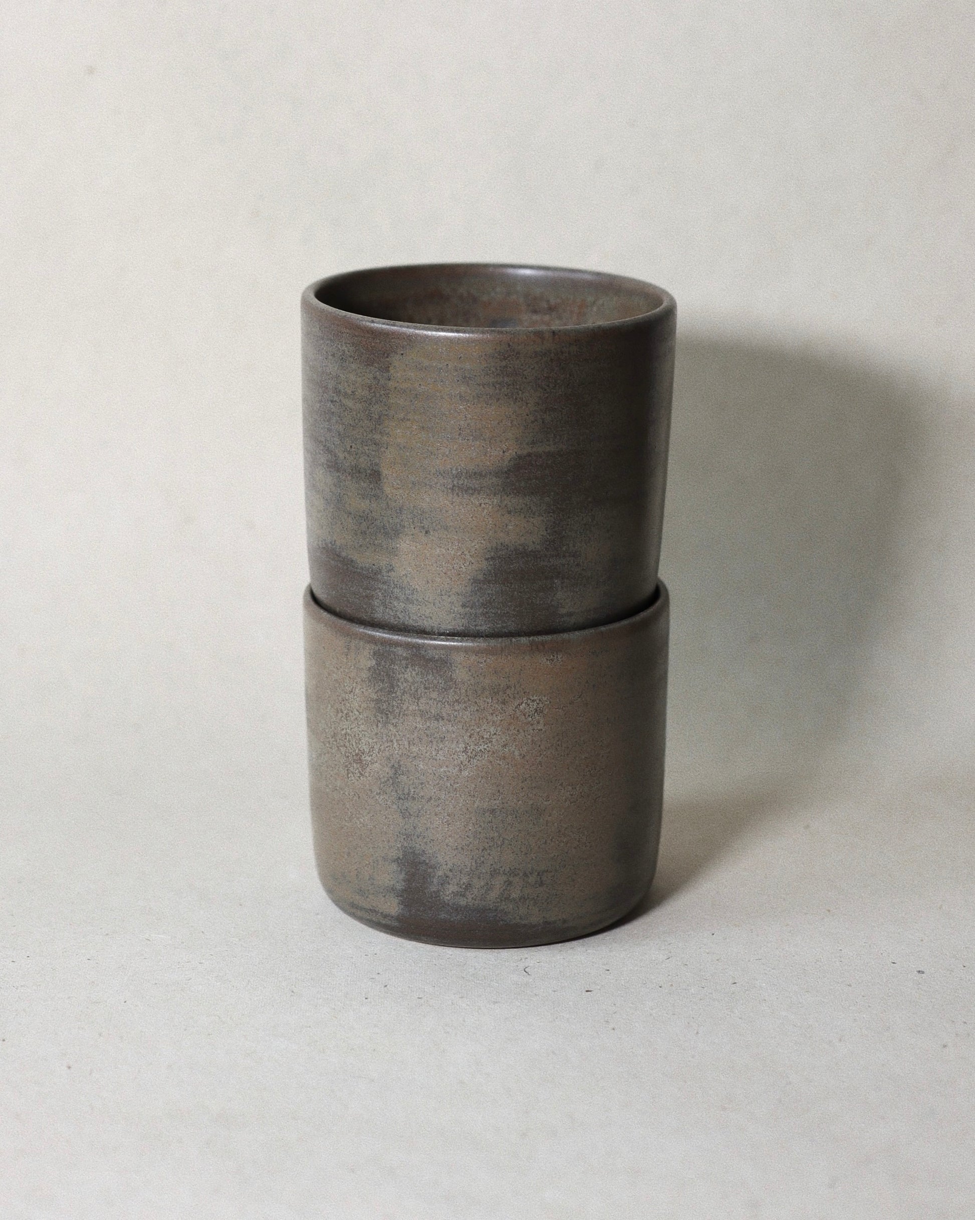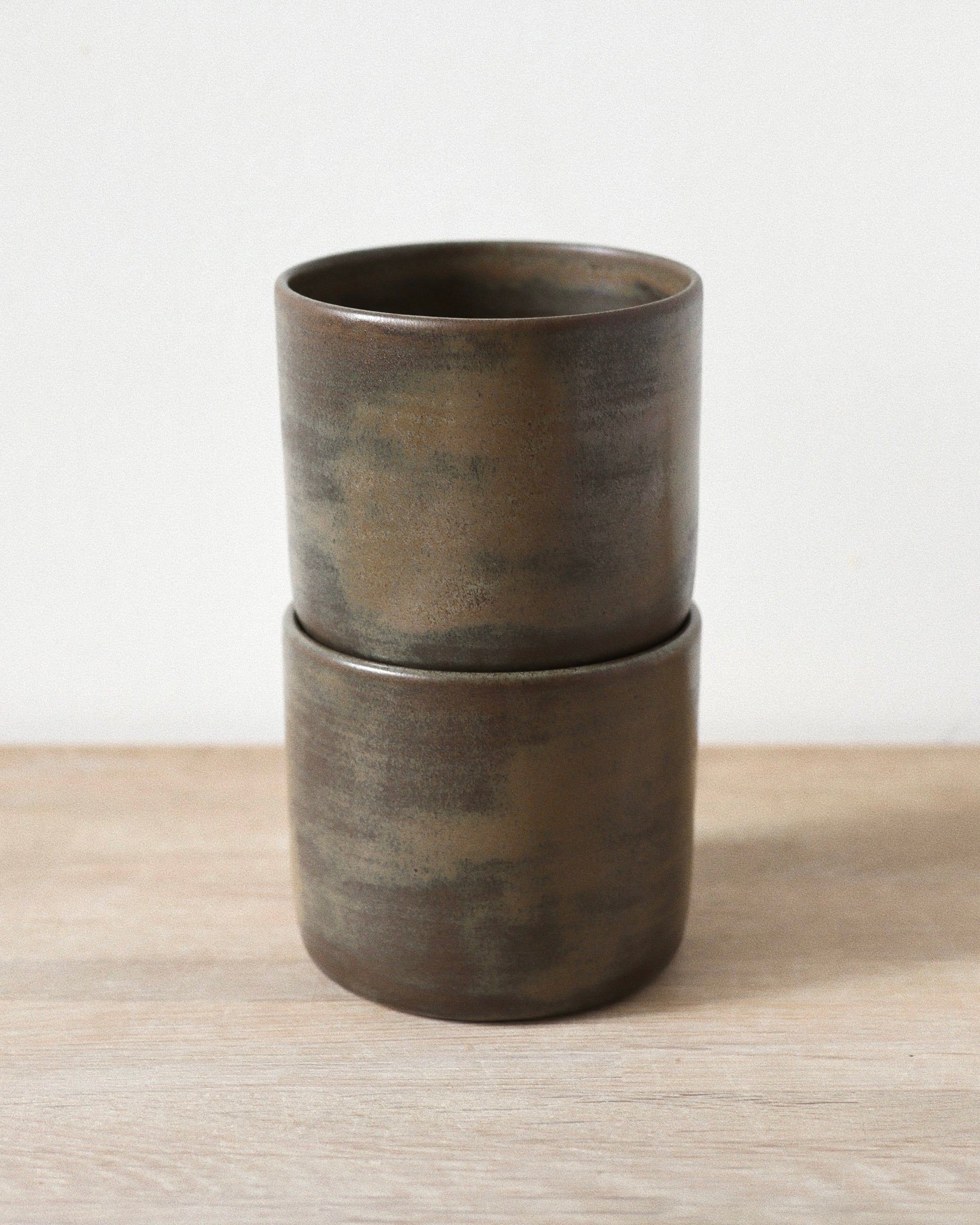 This pair of wheel-thrown cups is crafted from high-quality toffee stoneware, fired up to 1220 °C. Finished in a rustic Terra glaze with a soft matte surface that varies gently in tone throughout each cup, giving every piece a distinct, natural character.